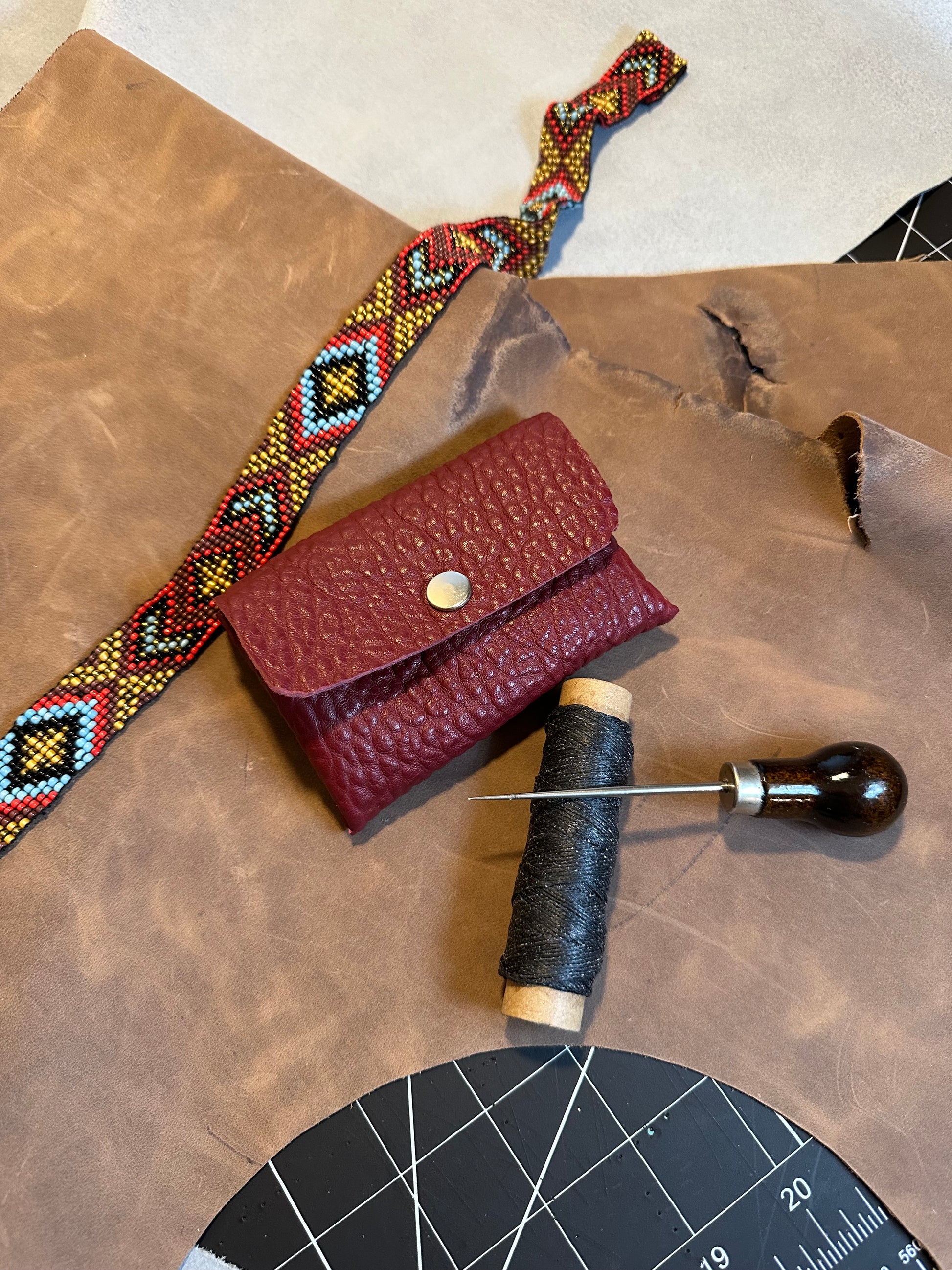 This is a hand crafted full grain leather custom coin purse / card wallet. It measures 4 inches wide and 3 inches tall. This coin purse is hand made by me right here in the USA.
