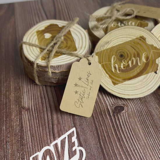 These are custom laser engraved wooden coasters with a natural bark edge. They come in a set of four with a mixture of Iowa designs.