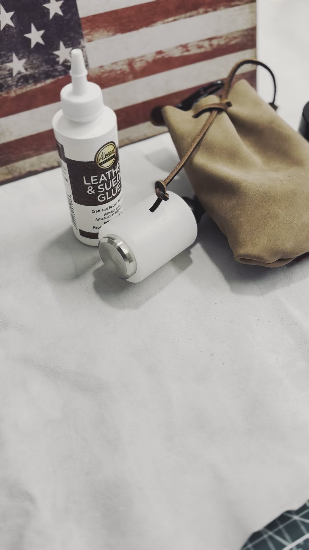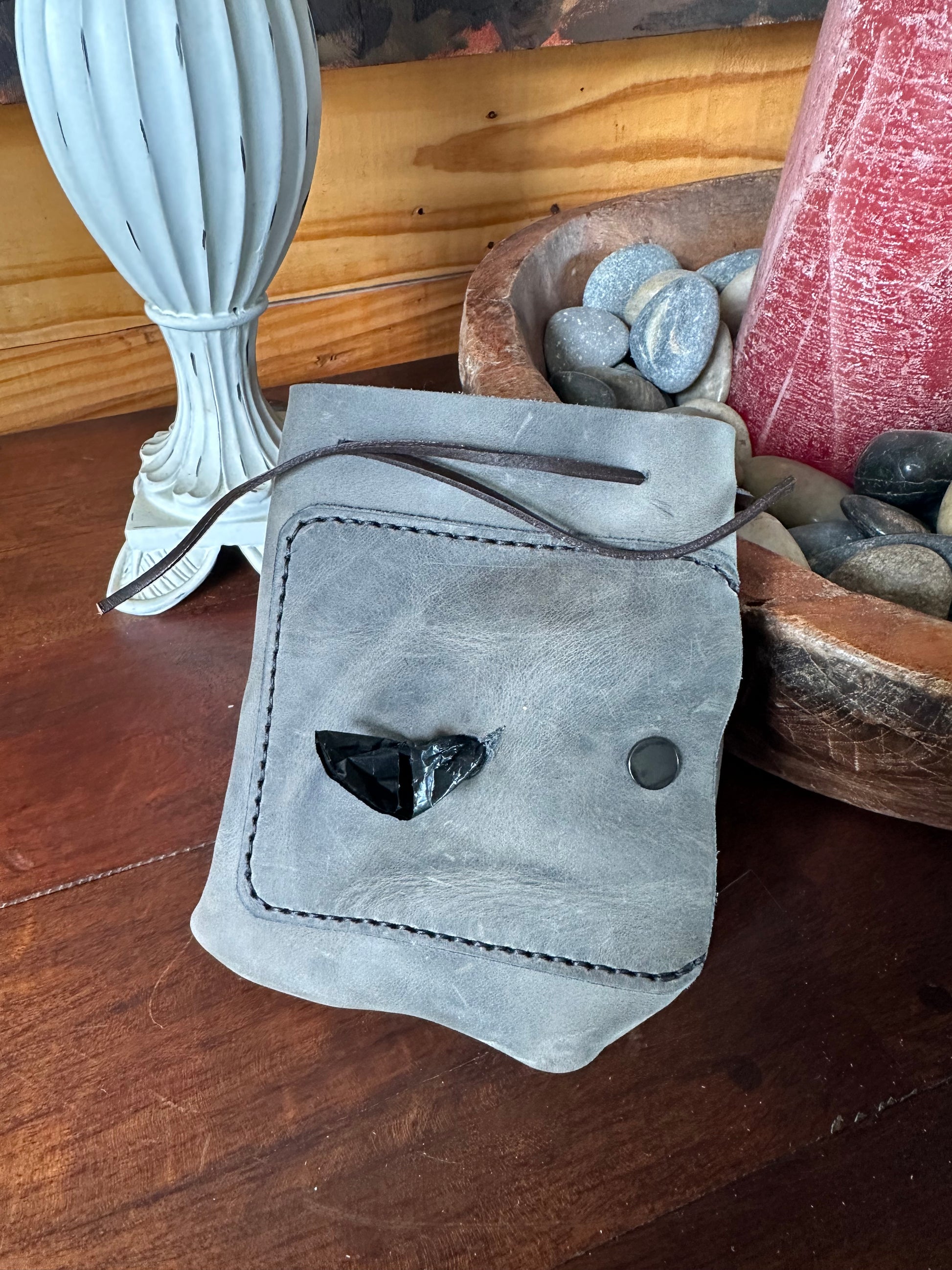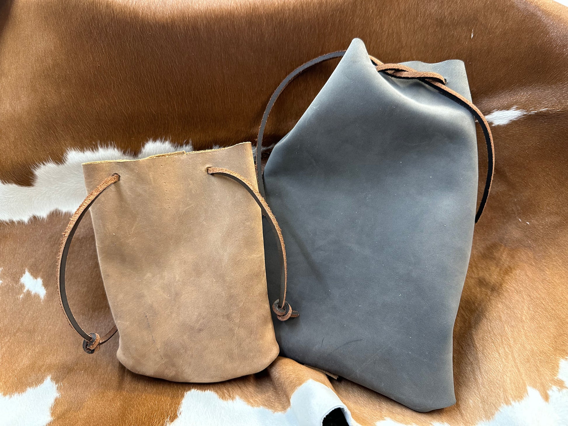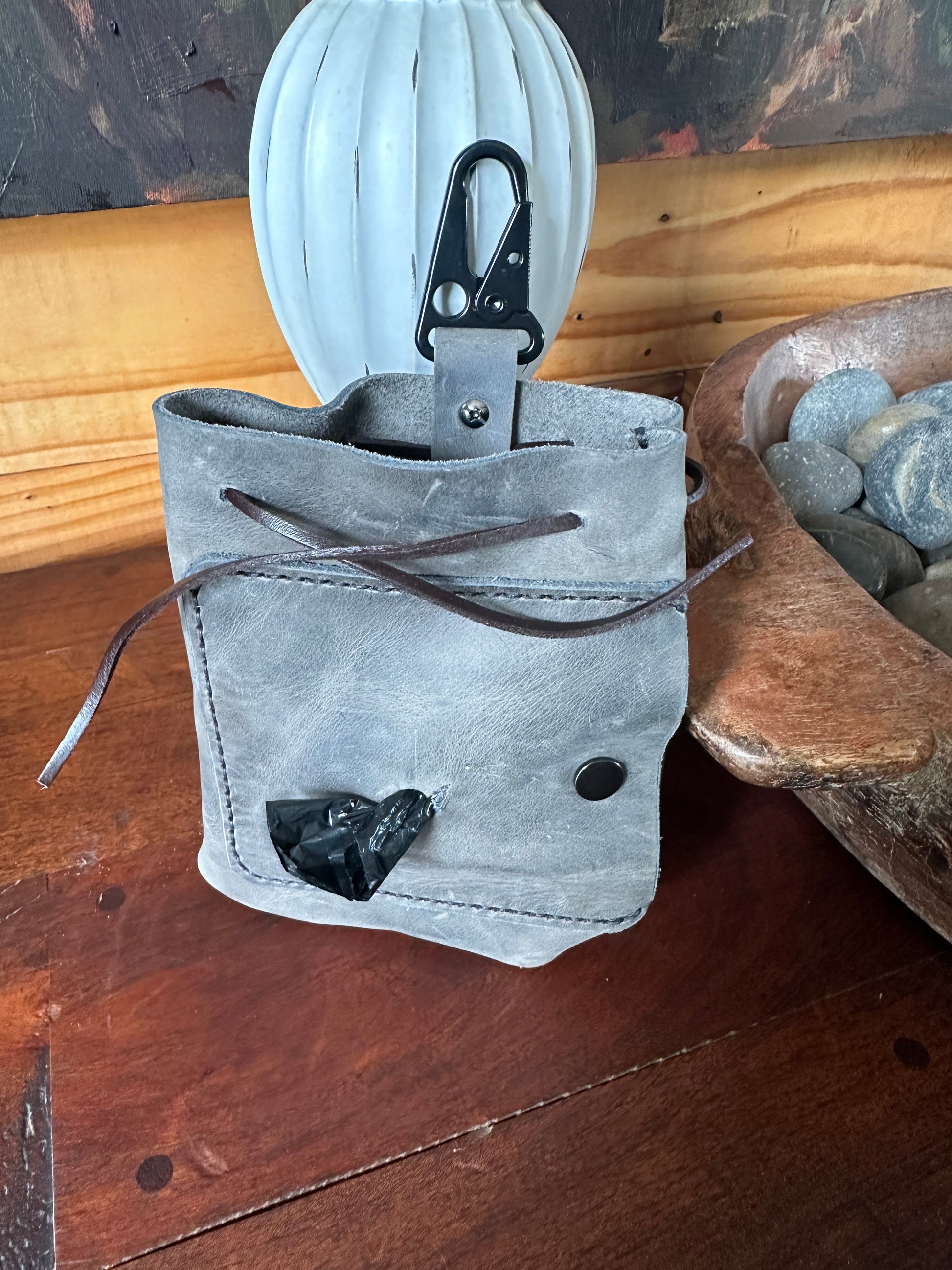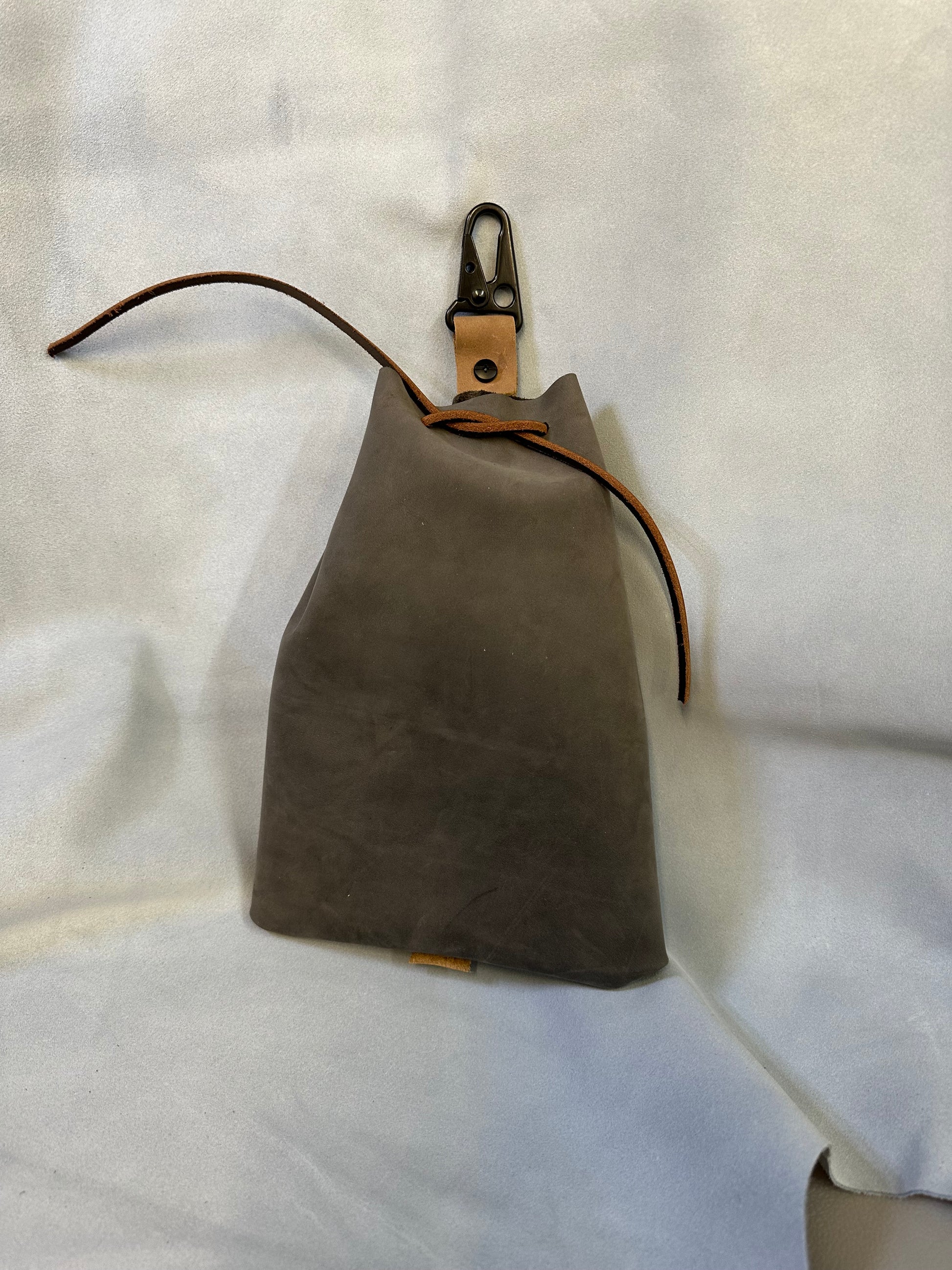 Each bag is made out of beautiful crazy horse leather with Veg Tan cordage and support straps. The hardware is a flat black d-ring for attaching to a belt loop.